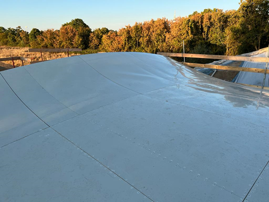 Besondere Herausforderungen ergaben sich bei der Schalung, insbesondere aufgrund der sportlichen Bauzeit und der komplexen Geometrie mit hohen Anforderungen an die Betonoberfläche. Die Biegung einzelner Schalelemente in zwei Richtungen stellte eine technische Herausforderung dar, die sich auch auf die Bewehrung auswirkte. Zudem war die Schalung über mehrere Wochen ungeschützt den Witterungseinflüssen ausgesetzt, während die Bewehrung eingebaut werden musste. Für diese Anforderungen wurde eine innovative Lösung gefunden.